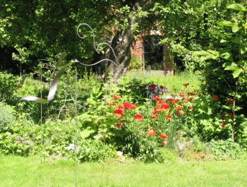 Blick auf die Werkstatt im Juni, in der Zeit der Mohnblüte |