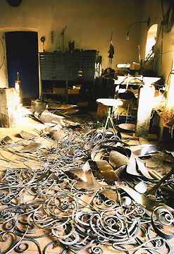 Schmieden von den Stangen und das Treiben der Bleche. Da Henning Greve gerne die Formen und Kompositionen bis zur Vollendung entwickelt, ist sein Bereich das Schweißen, Auswiegen, Ausrichten und Überarbeiten. Diese